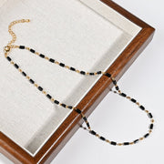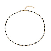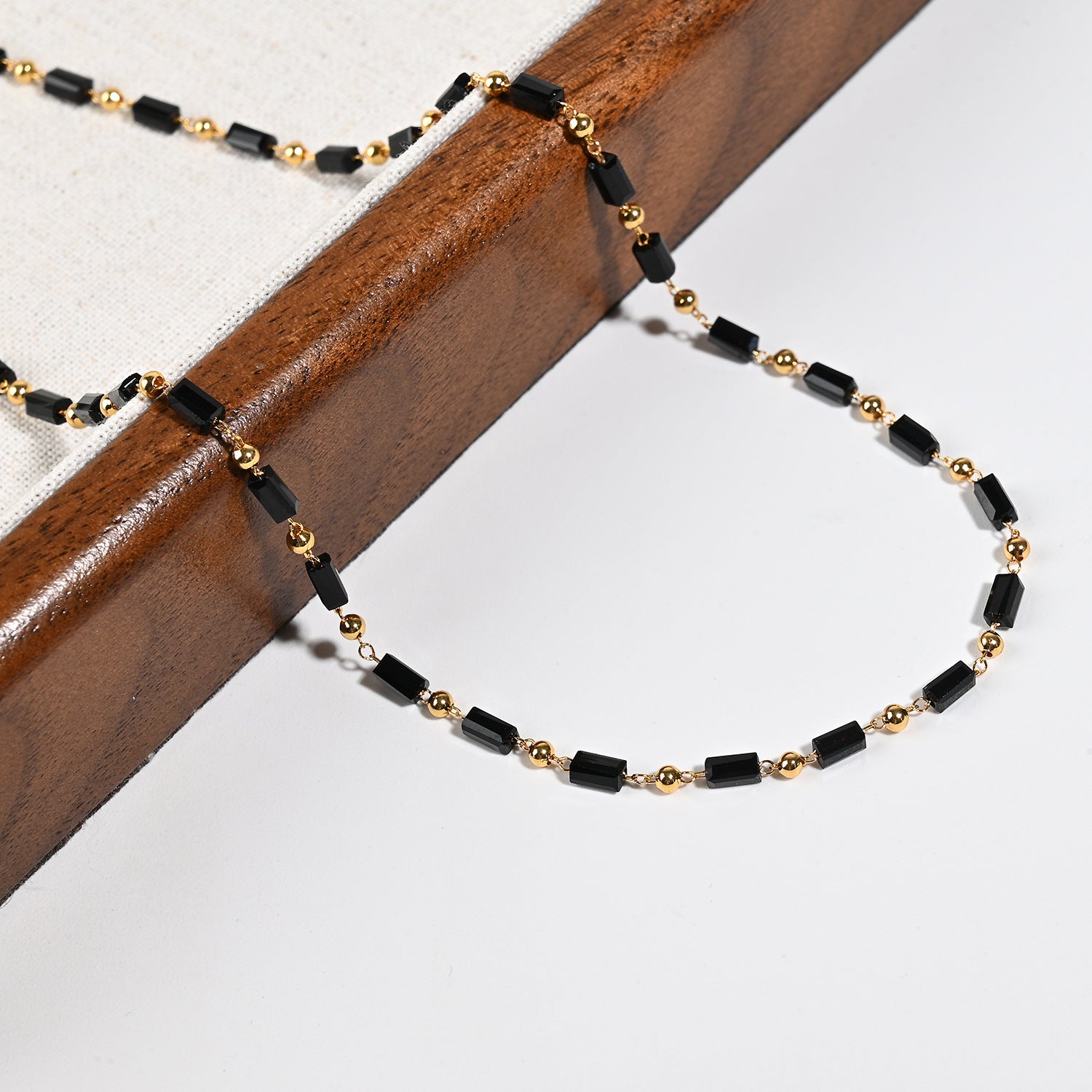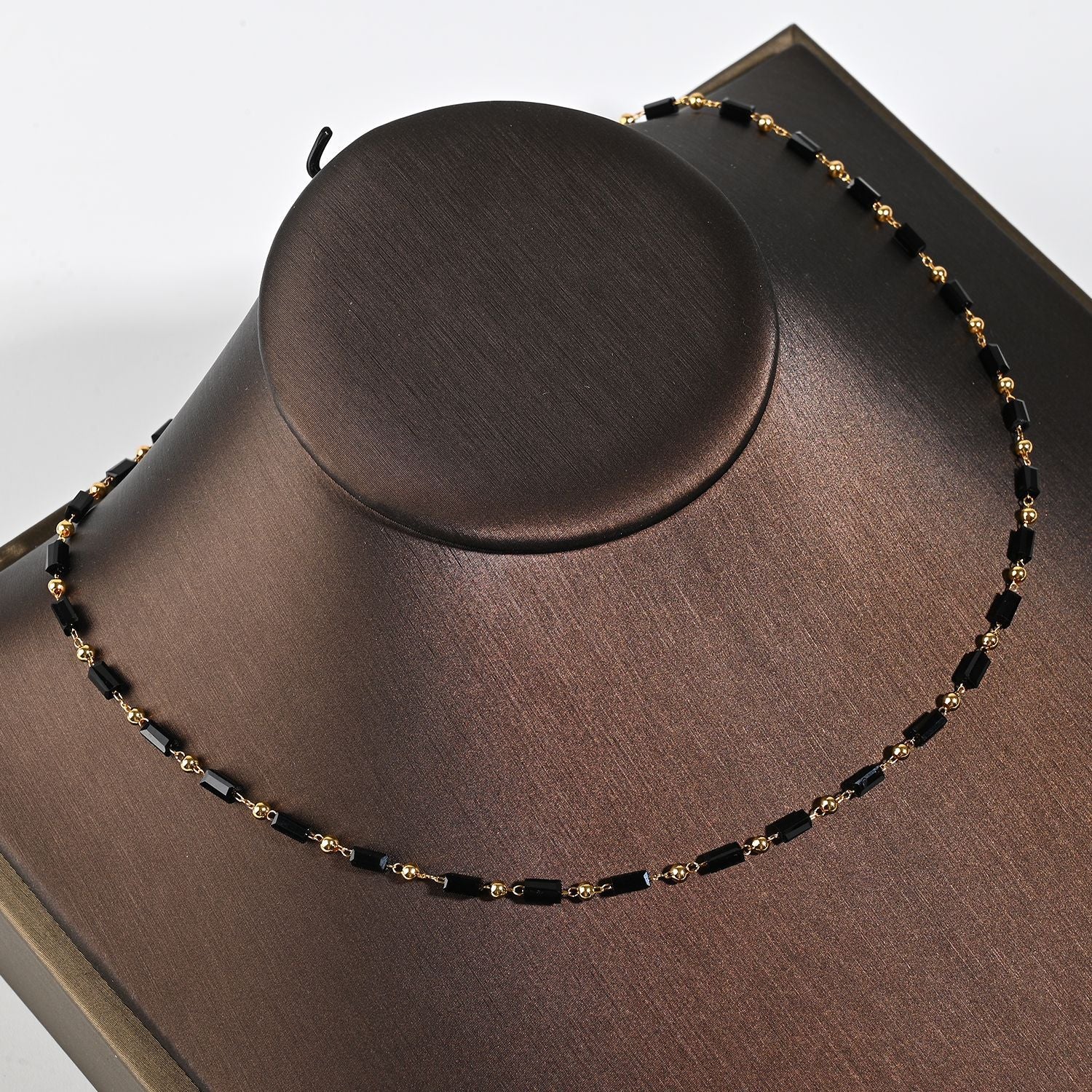 This chic necklace features black spinel beads, crafted from glass to mimic the striking appearance of genuine spinel gemstones. The cylindrical black beads are elegantly interspersed with small gold-colored spacer beads, adding a refined touch to the design. The necklace is secured with a lobster claw clasp and includes an adjustable chain for customizable length. With its simple yet sophisticated look, this versatile accessory is perfect for adding an element of elegance to any outfit, whether for everyday wear or special occasions.